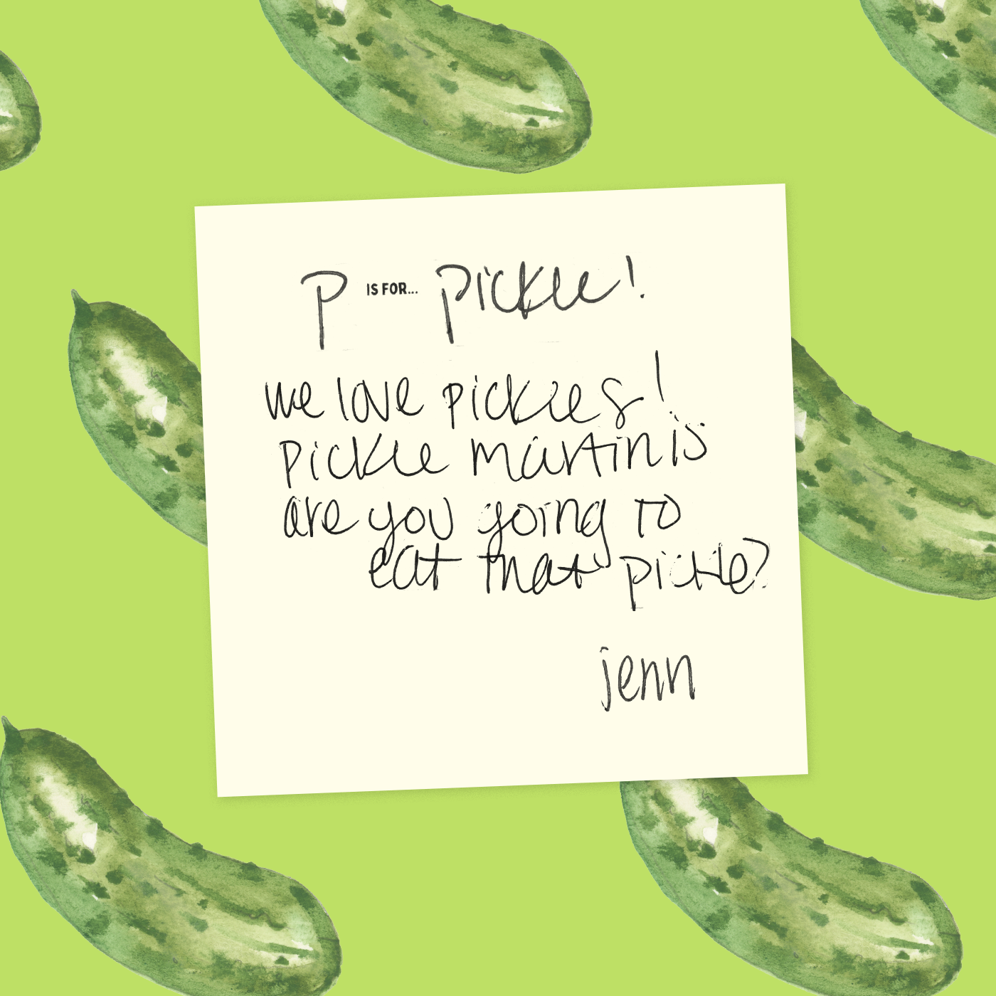 "We love pickles! Pickle martinis. Are you going to eat that pickle?"