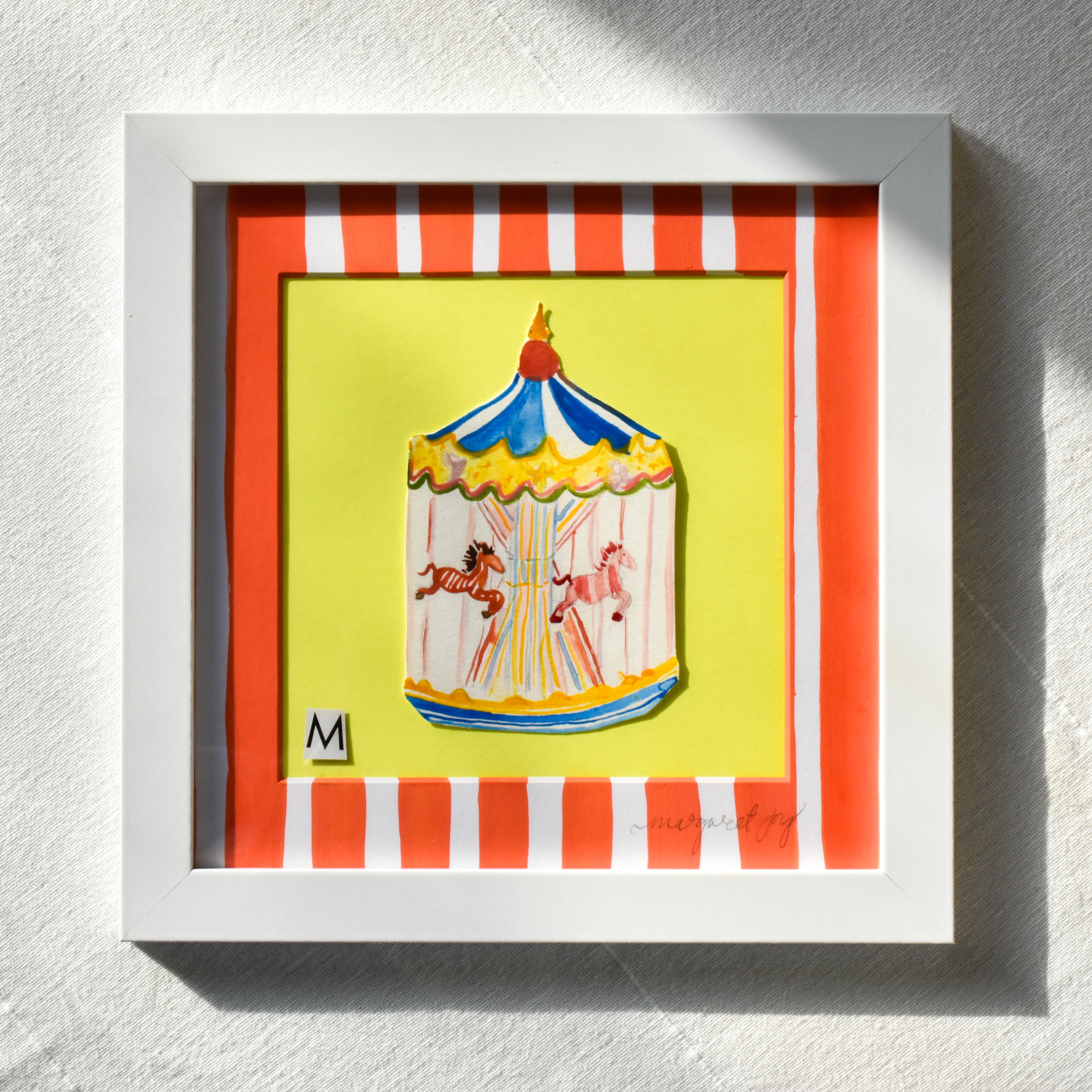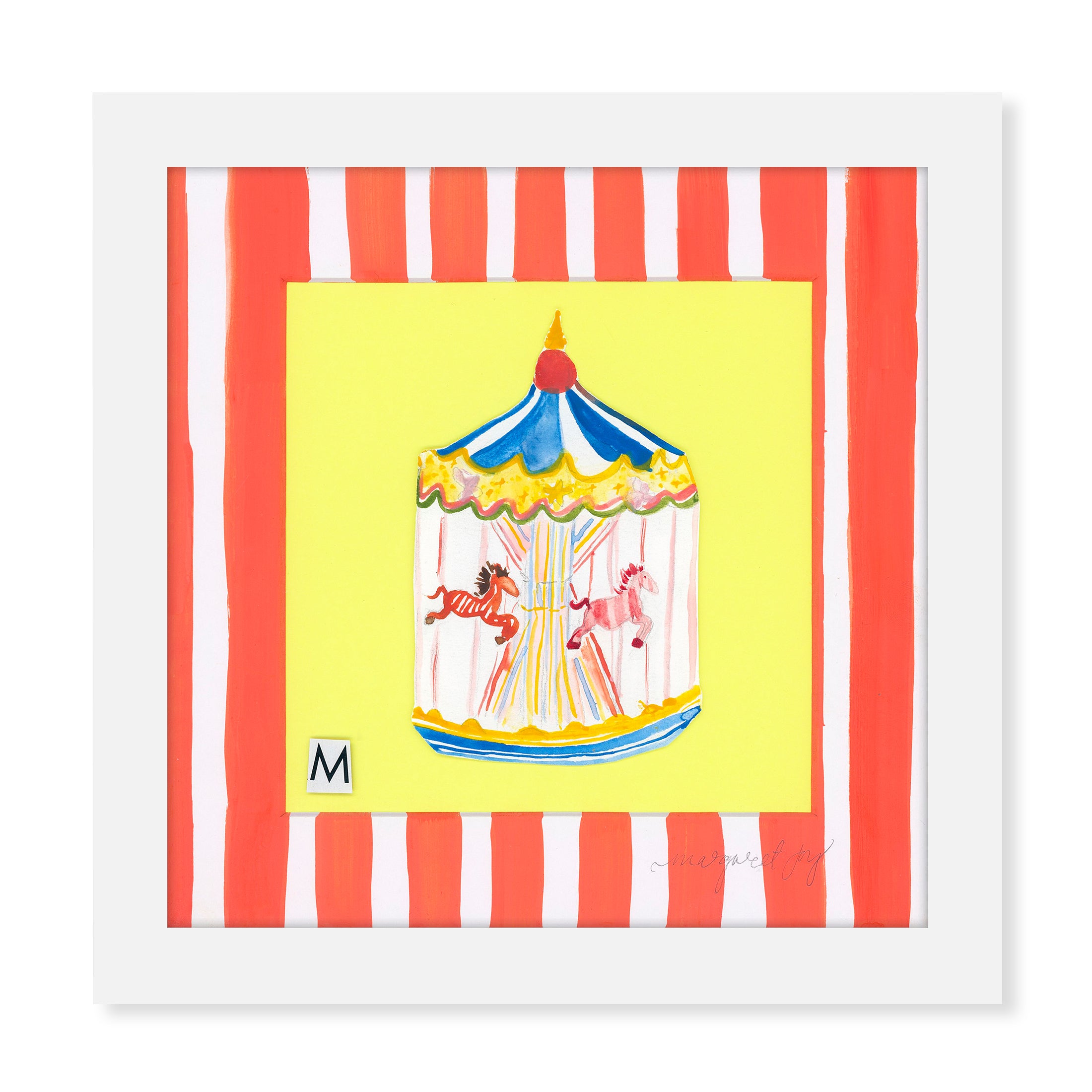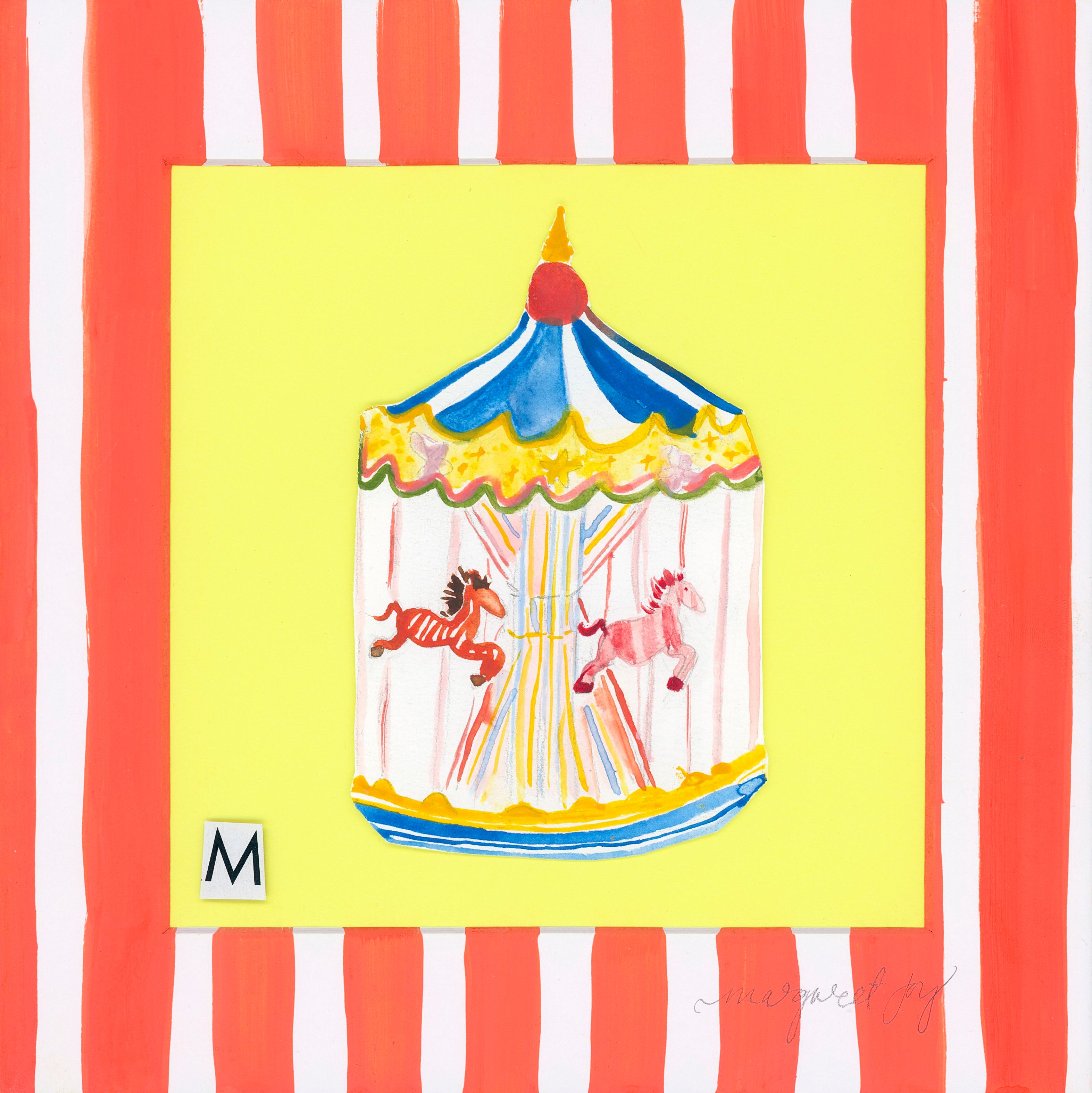 Step into nostalgia with this whimsical piece from the "MJ & Friends Vol. 1" collection. This playful yet elegant watercolor artwork captures the timeless magic of a classic merry-go-round through a unique blend of watercolor and mixed media elements. Perfect for anyone who cherishes childhood memories or appreciates whimsical art, this piece celebrates the intersection of nostalgia and artistic expression.