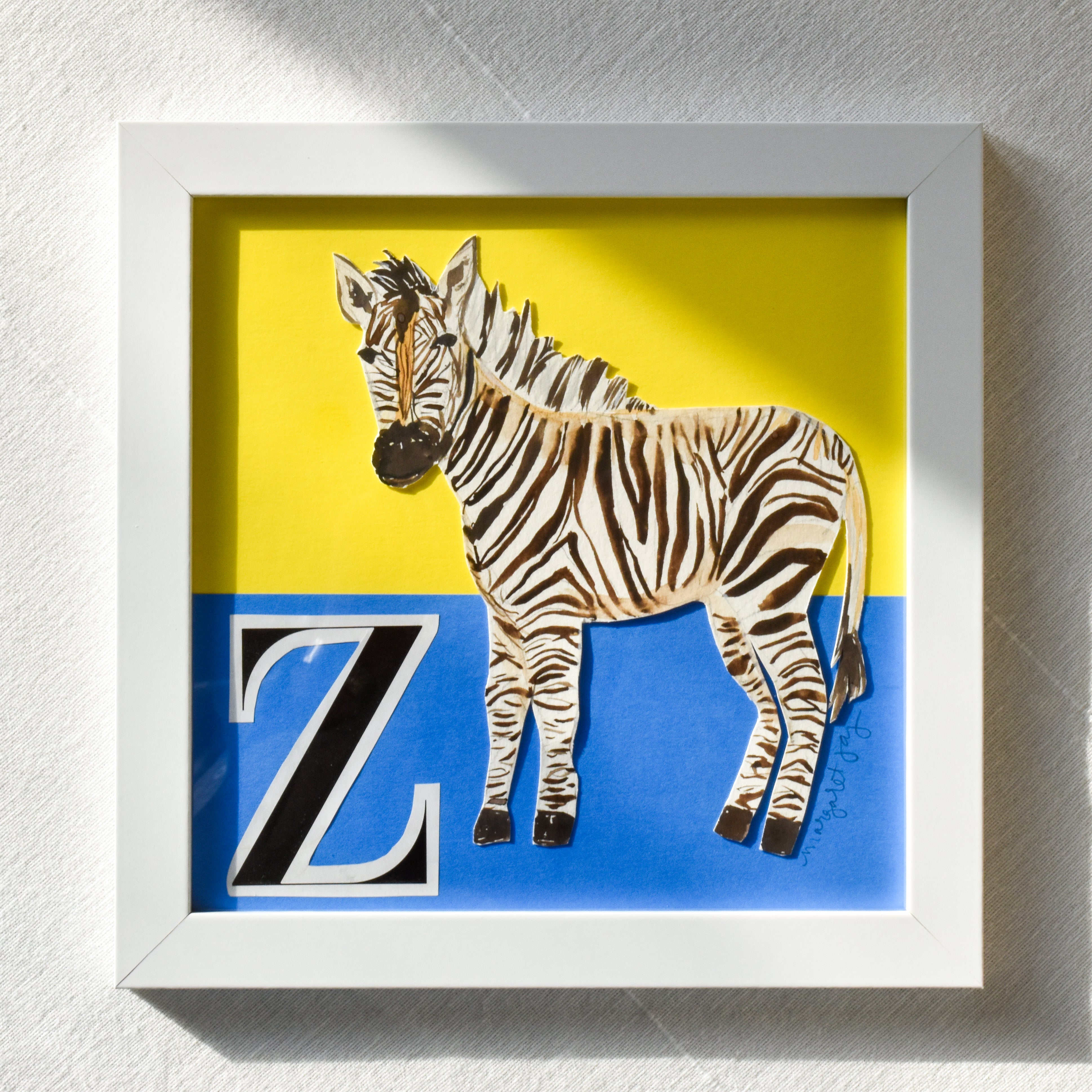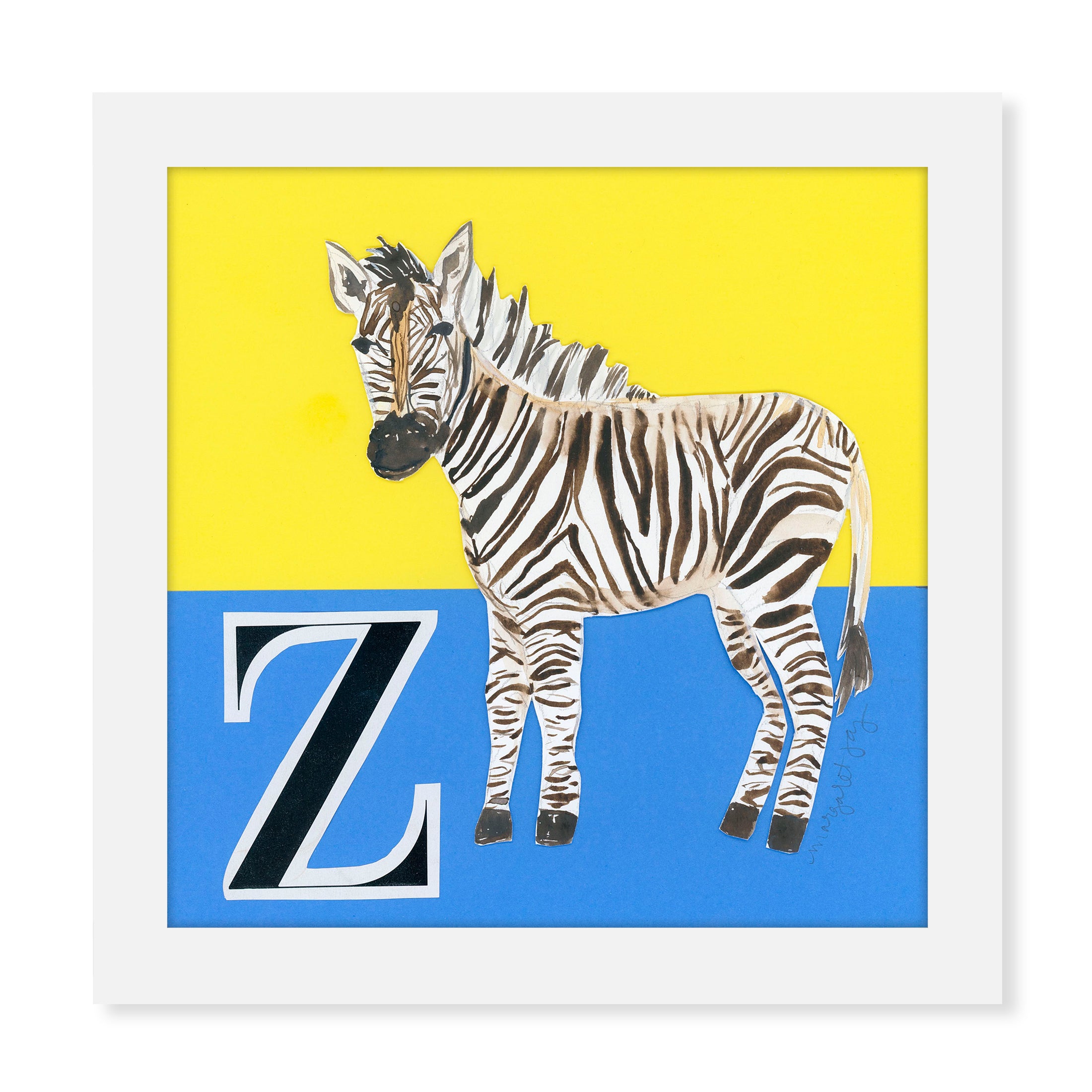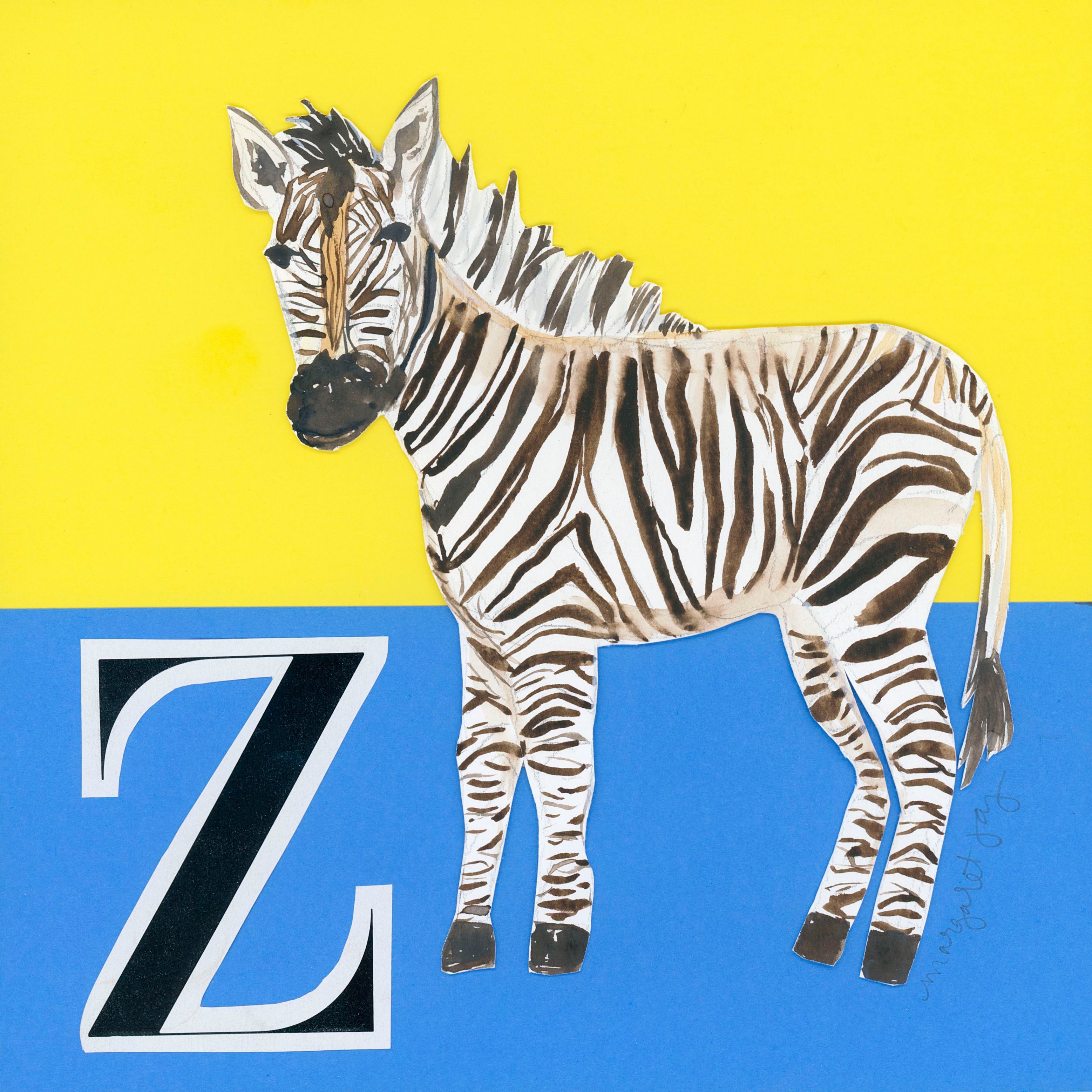 Step into the wild with this Zebra piece from the "MJ & Friends Vol. 1" collection! When building an alphabet collection, a zebra simply had to make the cut. This playful watercolor artwork captures the majestic beauty and distinctive stripes of this beloved African animal through a unique blend of watercolor and mixed media elements.